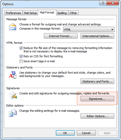Les instructions pour ajouter le bouton de chat à la signature de vos e-mails dans Microsoft Outlook est presque la même pour les versions 2007 et ultérieures d'Outlook. Veuillez suivre les instructions suivantes si vous voulez ajouter le bouton de chat à vos signatures d'e-mails HTML.
